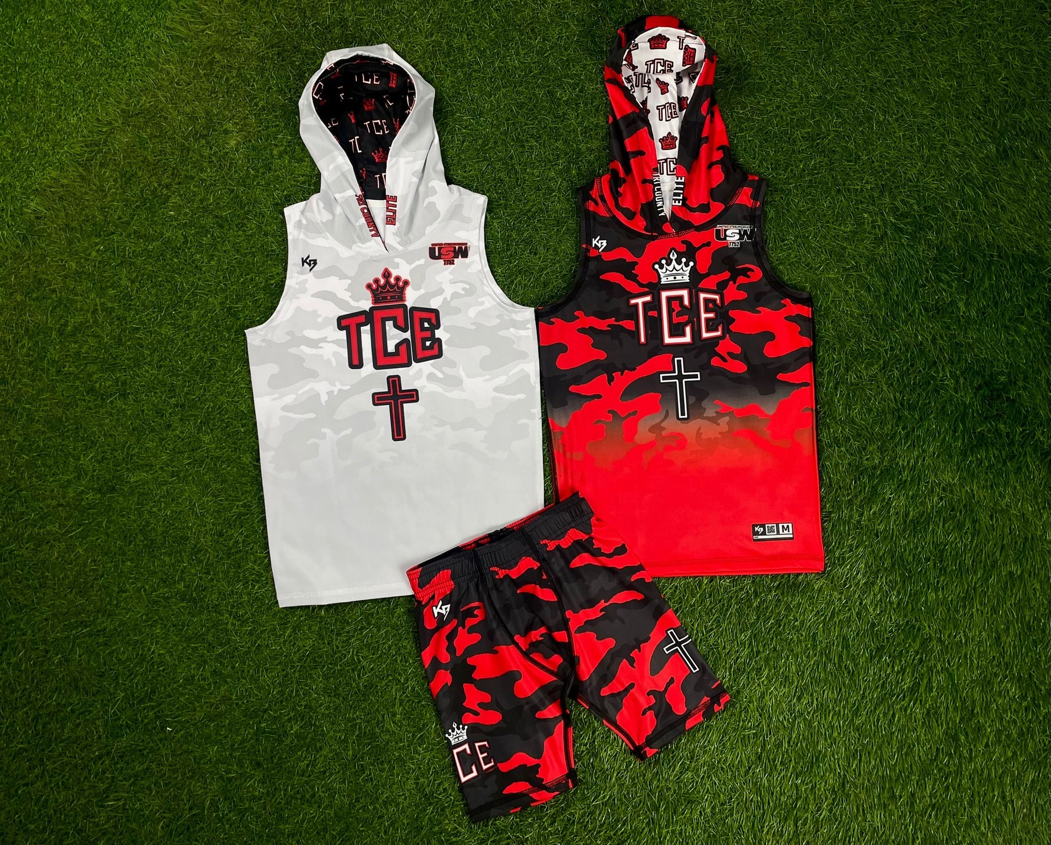 - Red, Black, White and Grey Flag Football Jerseys - Ace Flag Football Uniform Design Theme - Red and Black Camo Flag Football Jersey Design