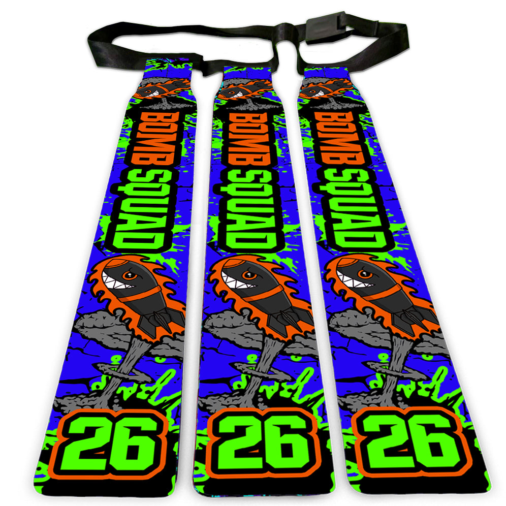 Make sure your team stands out with our fully Bomb Squad Custom Triple Threat Flags + Belt. Designed for performance and built to match your team’s uniforms, these Custom Flag Football Flags take your game — and your look — to the next level.