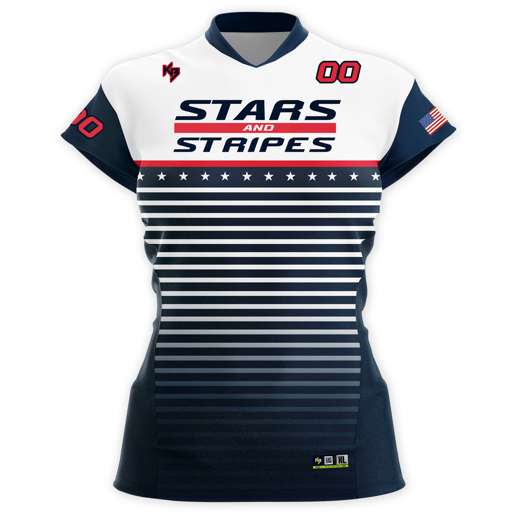 - Red White and Blue USA Girls Volleyball Uniforms - Stars and Stripes USA Red White and Blue Volleyball Uniform Design Theme